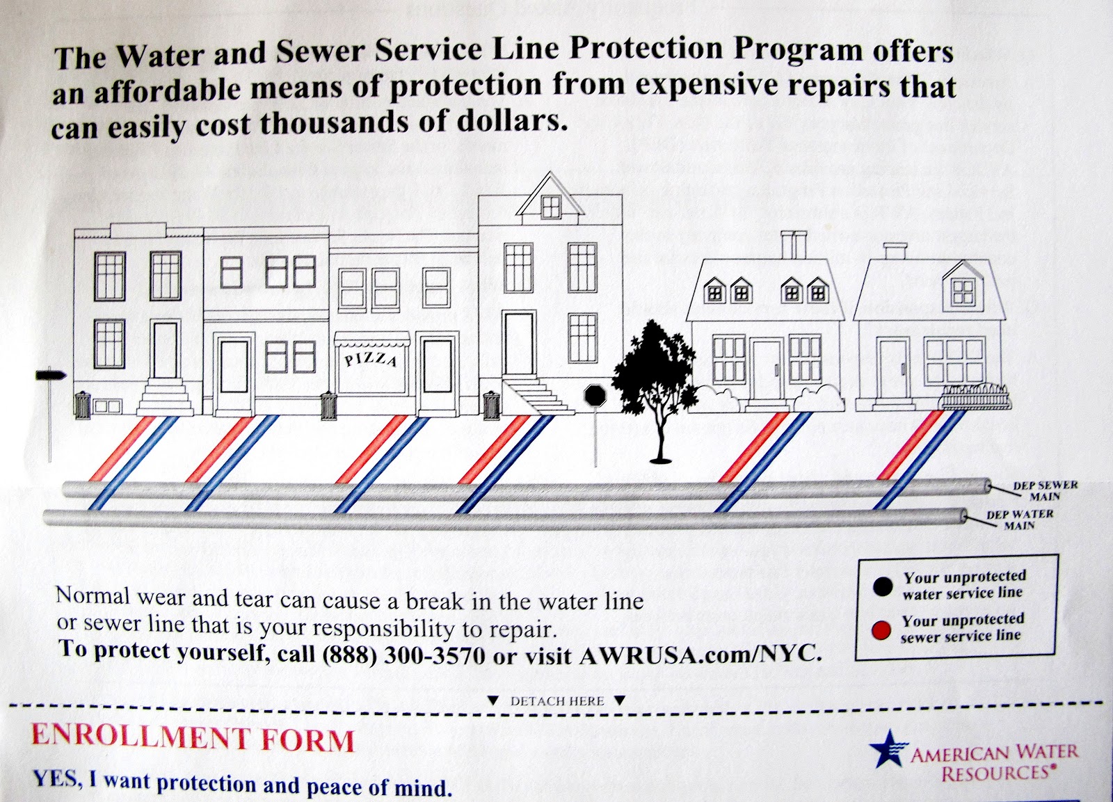The letter then goes on to explain that NYC homeowners are completely responsible for paying for any repairs to damaged water or sewer service lines that run from their homes to municipal services lines in the street. The repairs are not covered by homeowner insurance policies – and they are expensive ($3,000 – $5,000 for water lines, and $10,000 – $15,000 for sewer lines.) BUT the city is here to help. For $4.78 a month you get protection for your water line and for $8.70 a month you get protection for you sewer line.